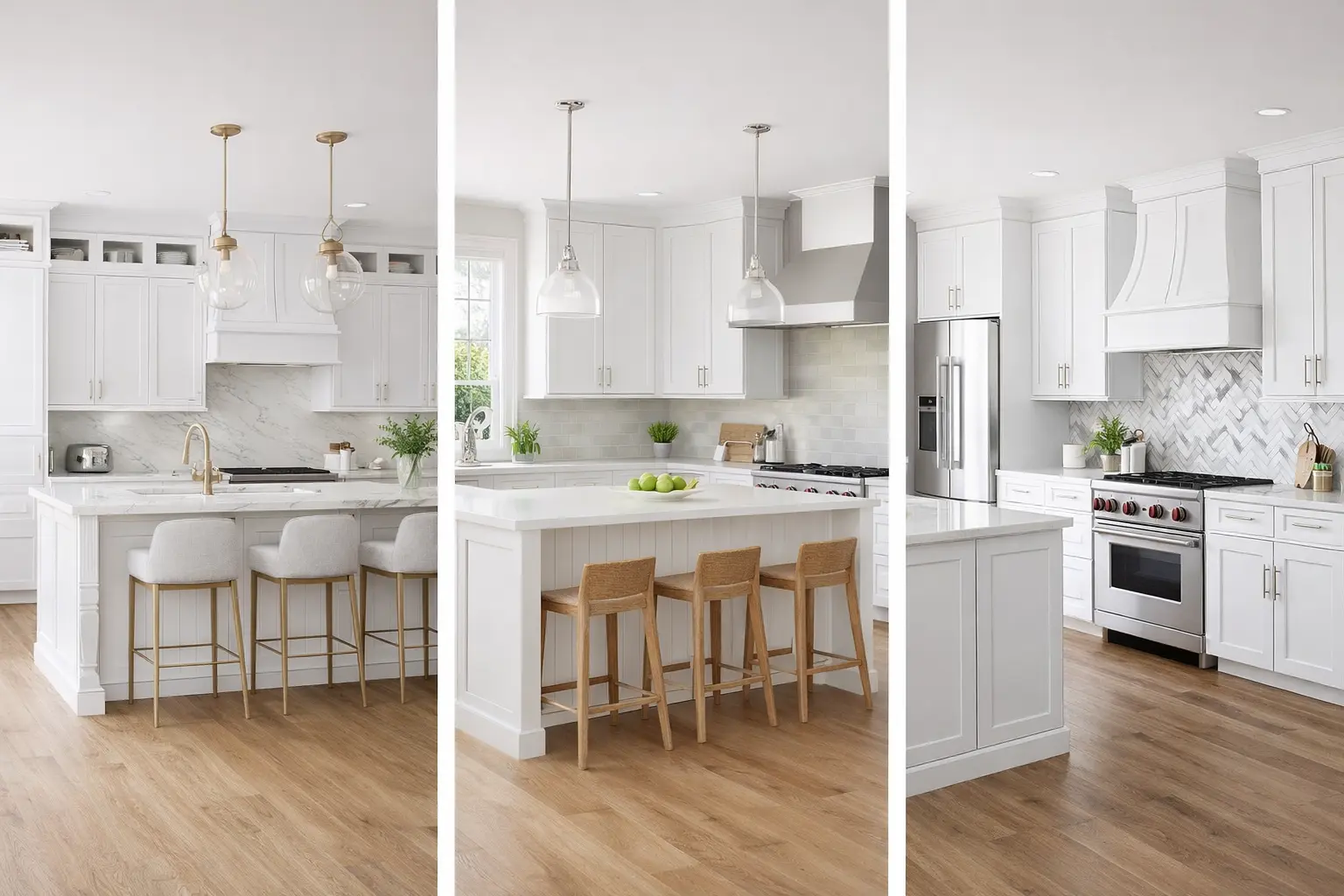 White works best in bright kitchens and is the stronger choice for resale value. Gray suits kitchens with moderate light and pairs especially well with lighter countertops like white quartz or marble. Both hold their style well over time. If you are unsure, review physical samples in your kitchen under natural light before deciding.